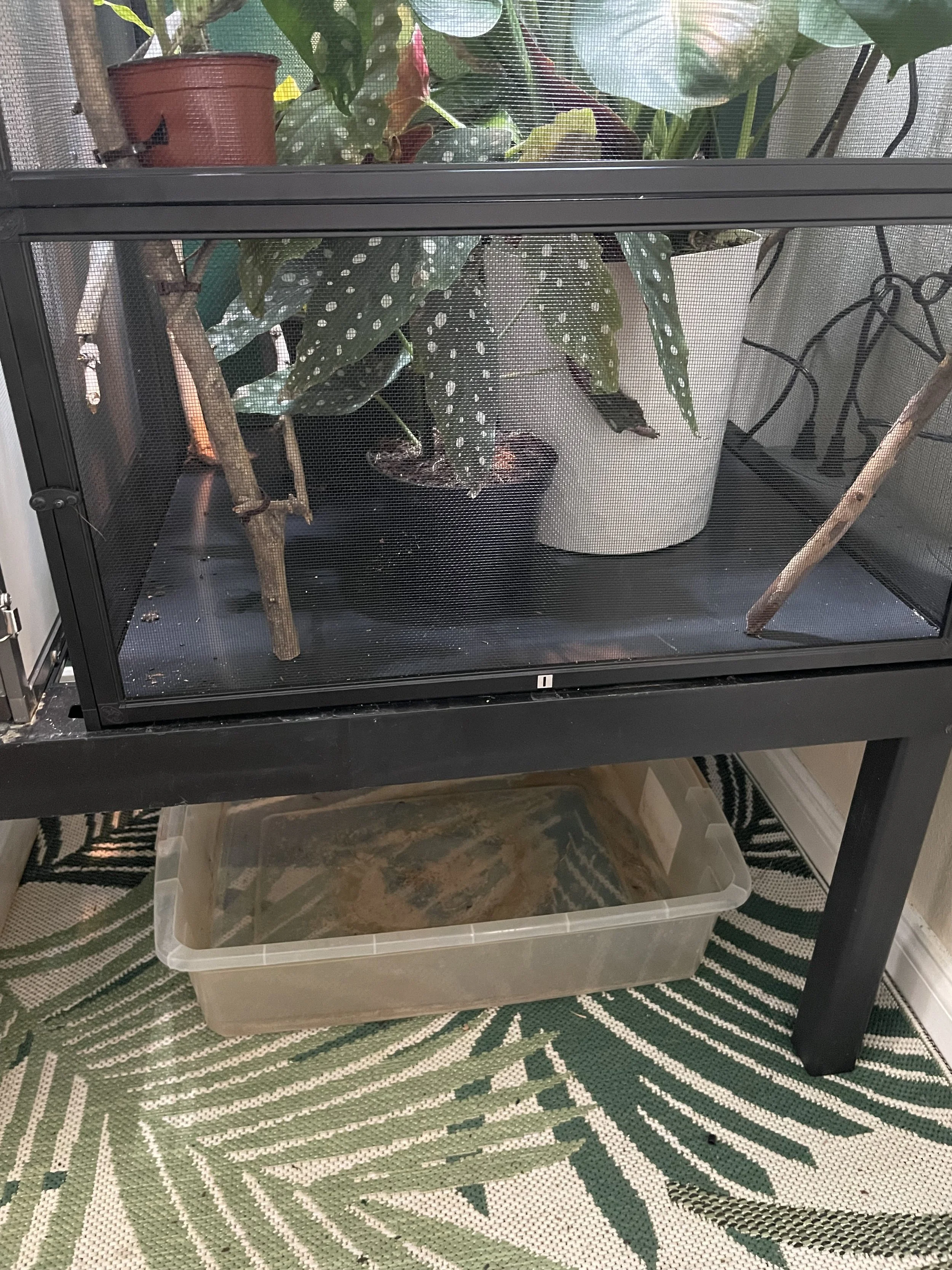 Between the misters, foggers, and drippers, there is a lot of water that comes with a chameleon enclosure. There are lots of different ways you can manage the water, but I will share what I do. I drill a few small holes in the bottom of the PVC floor and put my enclosure on top of a garage shelf and a bucket underneath. The water will pool towards the center and be caught in the bucket below. The rest of the water should be caught by the large potted live plants at the bottom of the enclosure.